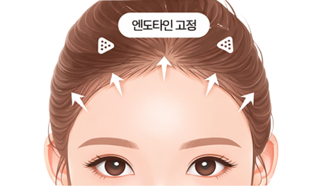 이마와 처진 부위를 위쪽으로 당겨, 유지인대와 SMAS층 등을 정리한 뒤 엔도타인을 이용해 고정합니다.